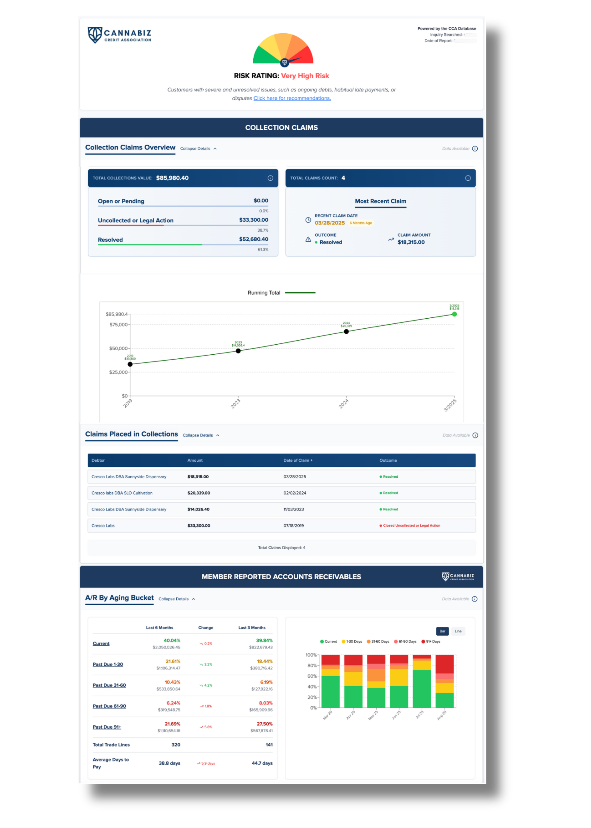 Gain access to a proprietary and ever-growing list of flagged cannabis debtors and AR data. Run checks before you start doing business to make sure you are making the best credit decision for your business while monitoring current accounts.